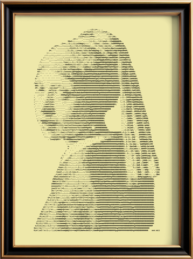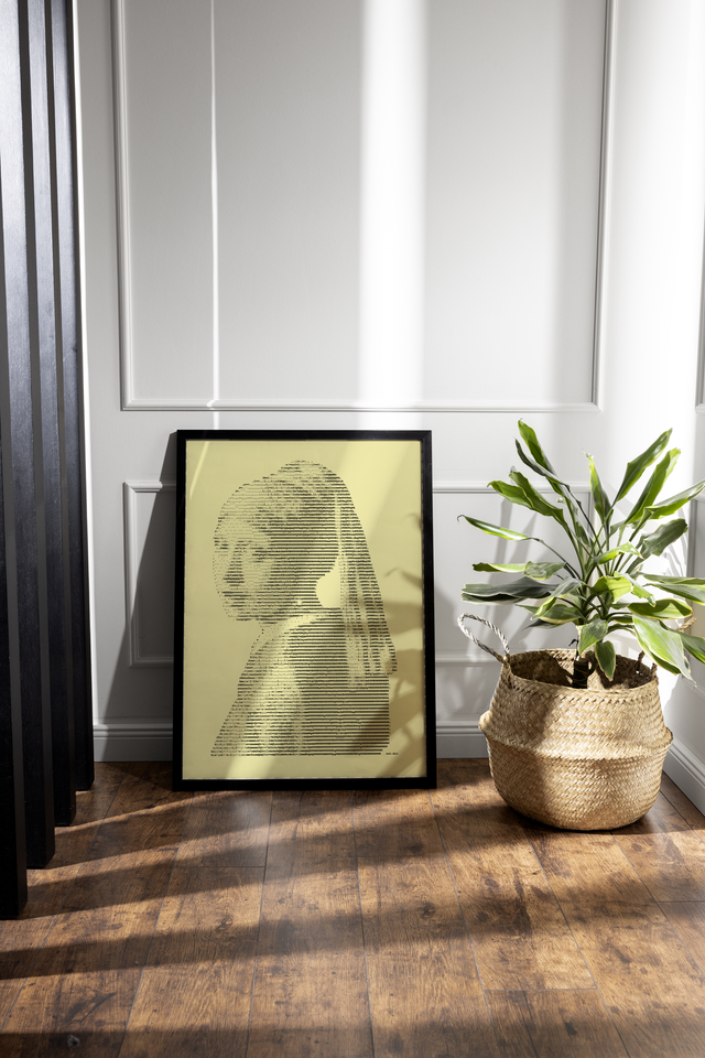 Edles Gemälde Meisje met de Parel im Format A3. Nylonfarbband auf feinem geripptem Papier in Elfenbein, 160 g/cm². Jedes Bild ist ein Einzelstück, das eigens auf der Schreibmaschine hergestellt wird.