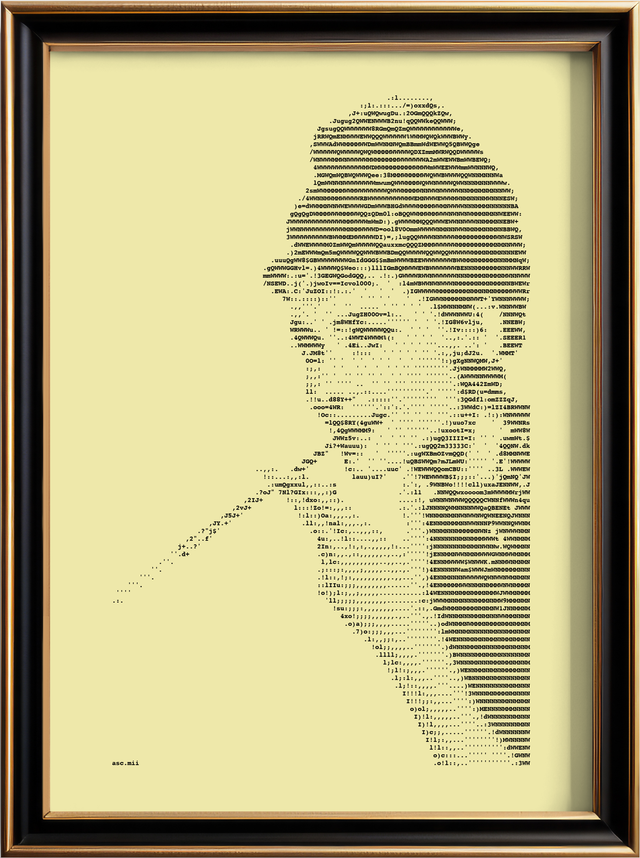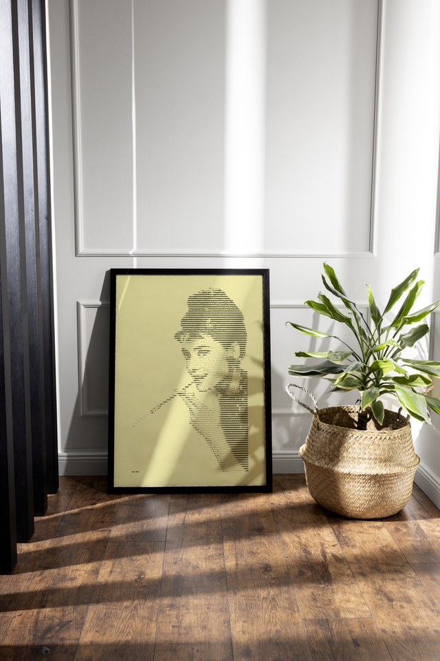 Edles Porträt von Audrey Hepburn im Format A3. Nylonfarbband auf feinem geripptem Papier in Elfenbein, 160 g/cm². Jedes Bild ist ein Einzelstück, das eigens auf der Schreibmaschine hergestellt wird.