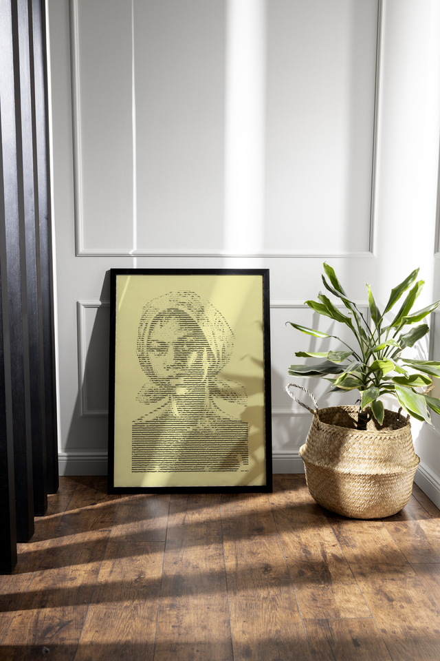 Edles Porträt von Dandara dos Palmares im Format A3. Nylonfarbband auf feinem geripptem Papier in Elfenbein, 160 g/cm². Jedes Bild ist ein Einzelstück, das eigens auf der Schreibmaschine hergestellt wird.