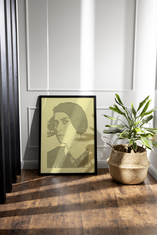 Edles Porträt von Else Lasker-Schüler im Format A3. Nylonfarbband auf feinem geripptem Papier in Elfenbein, 160 g/cm². Jedes Bild ist ein Einzelstück, das eigens auf der Schreibmaschine hergestellt wird.