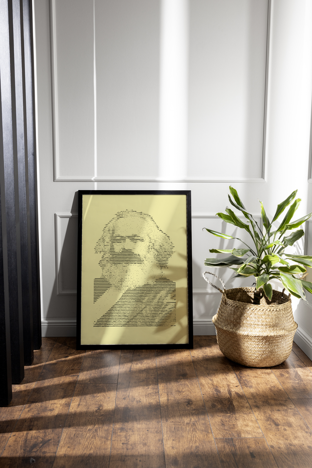 Edles Porträt von Karl Marx im Format A3. Nylonfarbband auf feinem geripptem Papier in Elfenbein, 160 g/cm². Jedes Bild ist ein Einzelstück, das eigens auf der Schreibmaschine hergestellt wird.