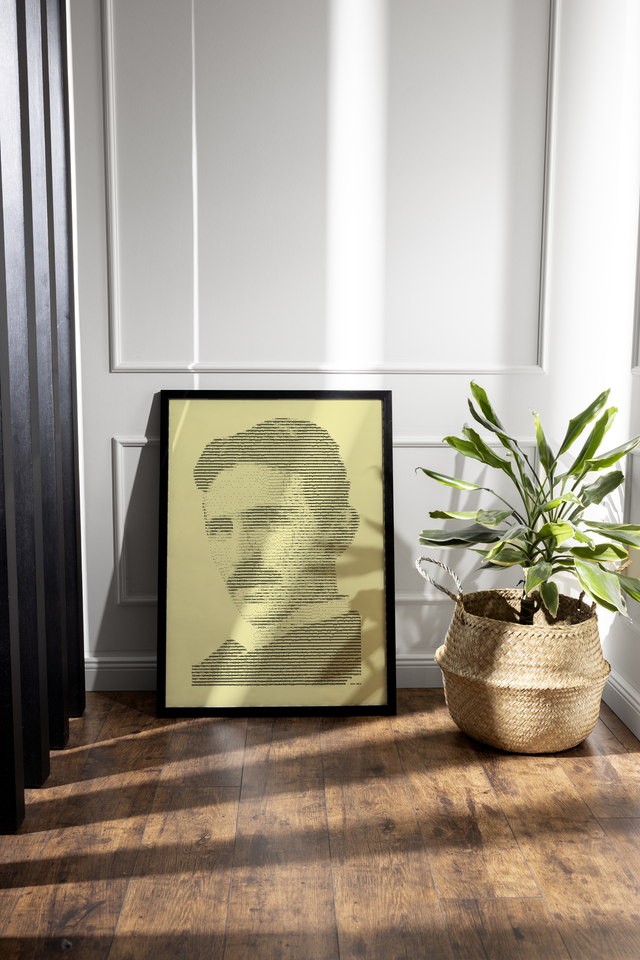 Edles Porträt von Nikola Tesla im Format A3. Nylonfarbband auf feinem geripptem Papier in Elfenbein, 160 g/cm². Jedes Bild ist ein Einzelstück, das eigens auf der Schreibmaschine hergestellt wird.