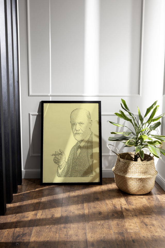 Edles Porträt von Sigmund Freud im Format A3. Nylonfarbband auf feinem geripptem Papier in Elfenbein, 160 g/cm². Jedes Bild ist ein Einzelstück, das eigens auf der Schreibmaschine hergestellt wird.