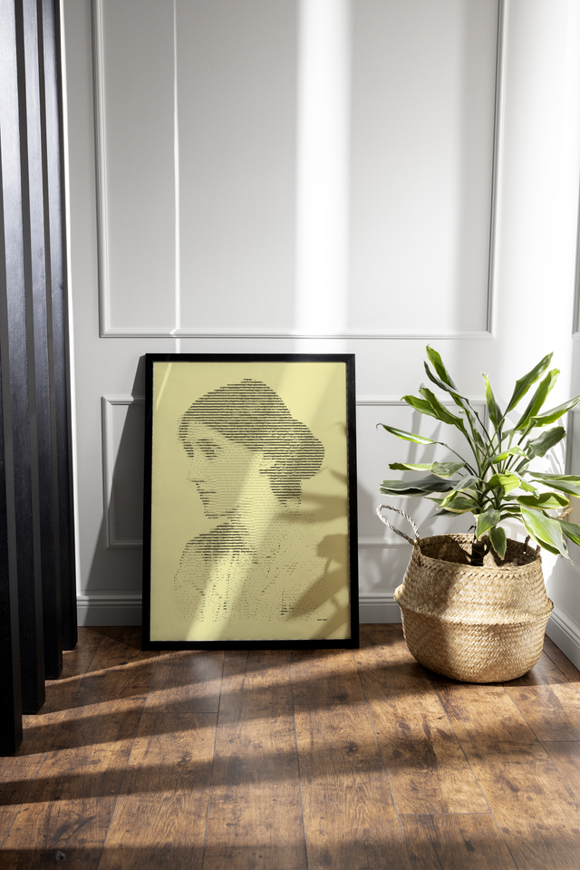 Edles Porträt von Virginia Woolf im Format A3. Nylonfarbband auf feinem geripptem Papier in Elfenbein, 160 g/cm². Jedes Bild ist ein Einzelstück, das eigens auf der Schreibmaschine hergestellt wird.
