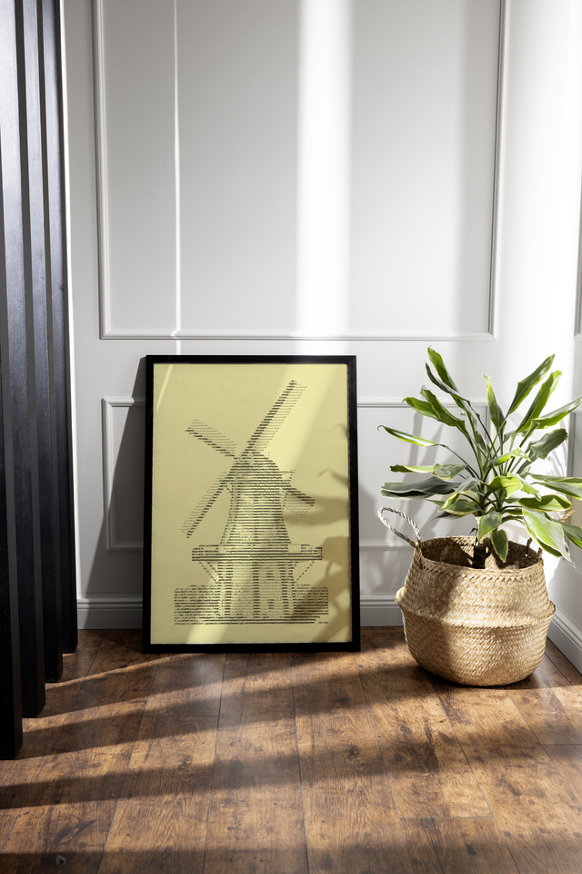 Edles Schreibmaschinenbild Windmühle im Format A3. Nylonfarbband auf feinem geripptem Papier in Elfenbein, 160 g/cm². Jedes Bild ist ein Einzelstück, das eigens auf der Schreibmaschine hergestellt wird.