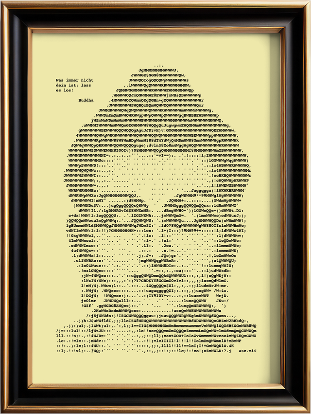 Edles Porträt von Buddha mit Zitat im Format A4. Nylonfarbband auf feinem geripptem Papier in Elfenbein, 160 g/cm². Jedes Bild ist ein Einzelstück, das eigens auf der Schreibmaschine hergestellt wird.