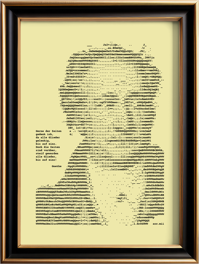 Edles Porträt von Goethe mit Zitat im Format A4. Nylonfarbband auf feinem geripptem Papier in Elfenbein, 160 g/cm². Jedes Bild ist ein Einzelstück, das eigens auf der Schreibmaschine hergestellt wird.