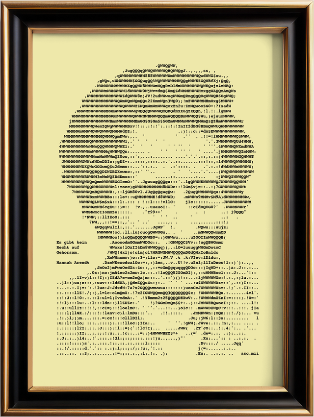 Edles Porträt von Hannah Arendt mit Zitat im Format A4. Nylonfarbband auf feinem geripptem Papier in Elfenbein, 160 g/cm². Jedes Bild ist ein Einzelstück, das eigens auf der Schreibmaschine hergestellt wird.