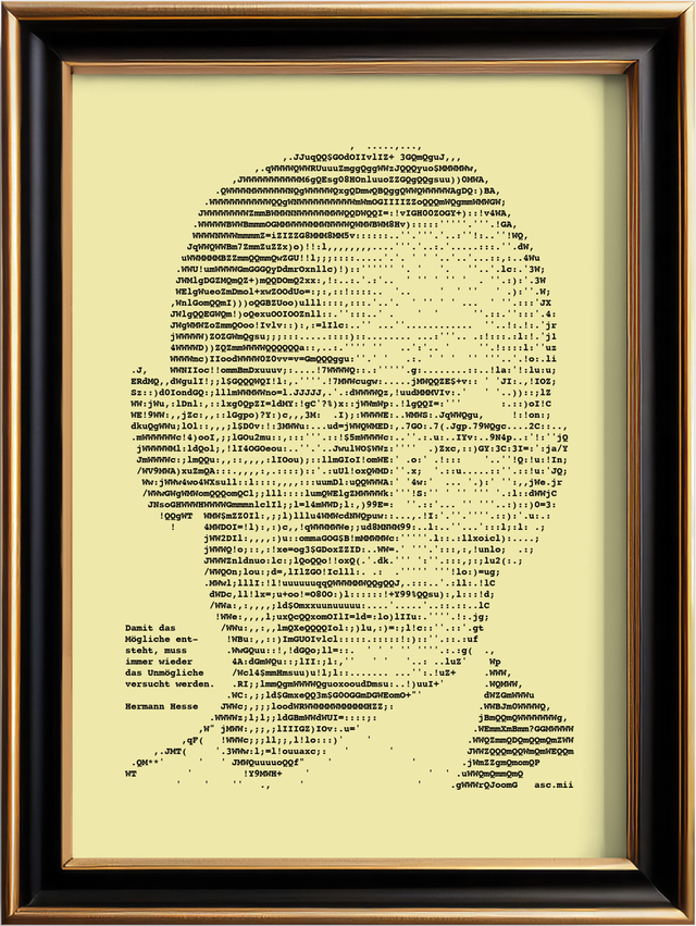 Edles Porträt von Hermann Hesse mit Zitat im Format A4. Nylonfarbband auf feinem geripptem Papier in Elfenbein, 160 g/cm². Jedes Bild ist ein Einzelstück, das eigens auf der Schreibmaschine hergestellt wird.