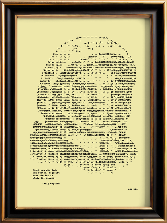Edles Porträt von Jurij Gagarin mit Zitat im Format A4. Nylonfarbband auf feinem geripptem Papier in Elfenbein, 160 g/cm². Jedes Bild ist ein Einzelstück, das eigens auf der Schreibmaschine hergestellt wird.