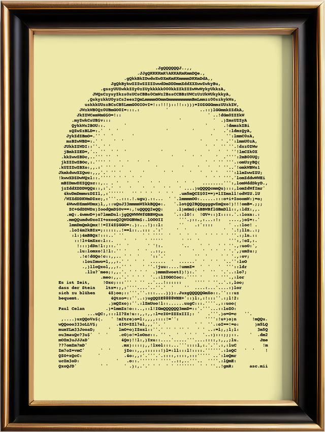 Edles Porträt von Paul Celan mit Zitat im Format A4. Nylonfarbband auf feinem geripptem Papier in Elfenbein, 160 g/cm². Jedes Bild ist ein Einzelstück, das eigens auf der Schreibmaschine hergestellt wird.