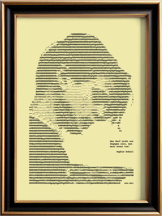 Edles Porträt von Sophie Scholl mit Zitat im Format A4. Nylonfarbband auf feinem geripptem Papier in Elfenbein, 160 g/cm². Jedes Bild ist ein Einzelstück, das eigens auf der Schreibmaschine hergestellt wird.